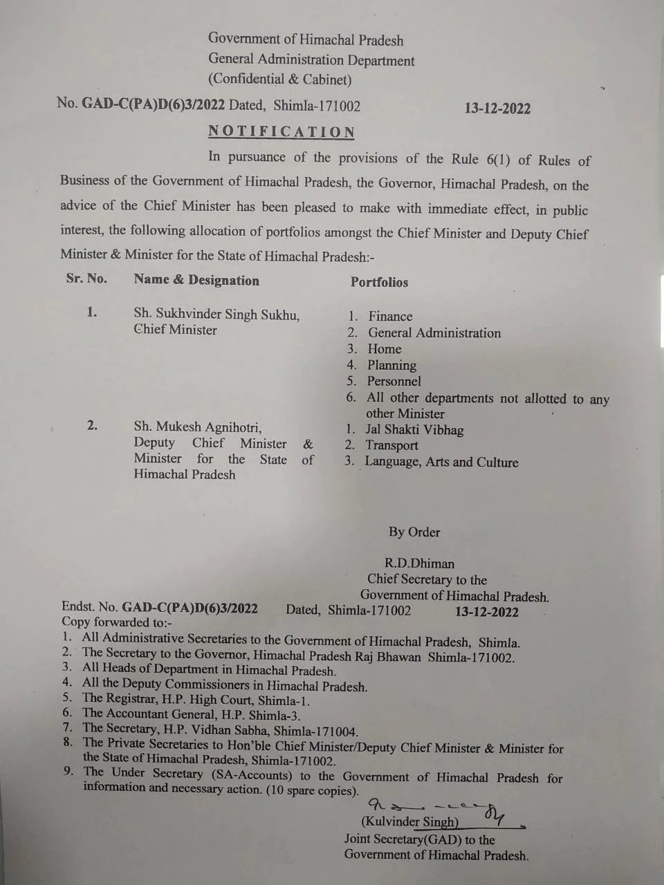 ब्यूरो,खबरनाउ : प्रदेश में नई सरकार बनने के बाद जहां मंत्री पद के लिए होड़ मची है . वहीं सीएम और डिप्टी सीएम की नियुक्ति की बाद उन्हें विभाग भी बांट दिए गए हैं. अभी कैबिनेट के गठन से पहले सीएम सुखविंदर सिंह सुक्खू और डिप्टी सीएम मुकेश अग्निहोत्री ने सभी विभाग आपस में बांट लिए हैं. हिमाचल सरकार के सामान्य प्रशासन विभाग (जीएडी) ने इस संबंध में मंगलवार देर रात को अधिसूचना जारी की.