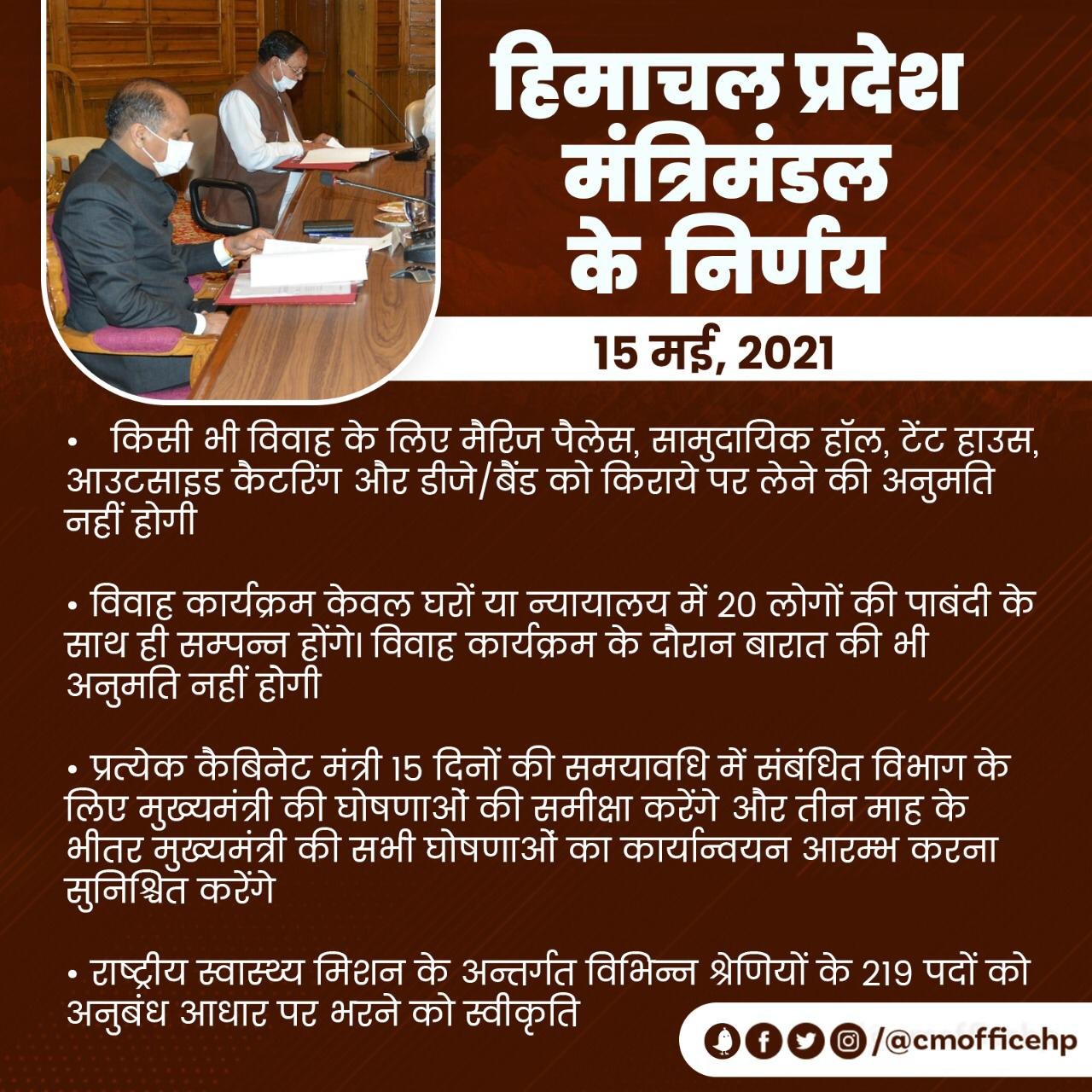 शिमला।कोरोना के बड़ते मामलों को देखते हुए प्रदेश सरकार ने कोरोना कर्फ़्यू को बढ़ाने का फैसला किया जिसके बाद अब पूरे प्रदेश में आगामी 26 तारीख़ तक कोरोना कर्फ्यू जारी रहेगा। मगर साथ ही इस बैठक में कुछ दूसरे महत्वपूर्ण निर्णय भी लिए गए जिसमें शादी समारोह को लेकर नए निर्देश जारी किए गए जिसमें किसी भी विवाह के लिए मैरिज पैलेस, सामुदायिक हाॅल, टेंट हाउस, आउटसाइड कैटरिंग और डीजे/बैंड को किराये पर लेने की अनुमति नहीं होगी। इसके अलावा विवाह कार्यक्रम केवल घरों या न्यायालय में 20 लोगों की पाबंदी के साथ ही सम्पन्न होंगे। विवाह कार्यक्रम के दौरान बारात की भी अनुमति नहीं होेगी।