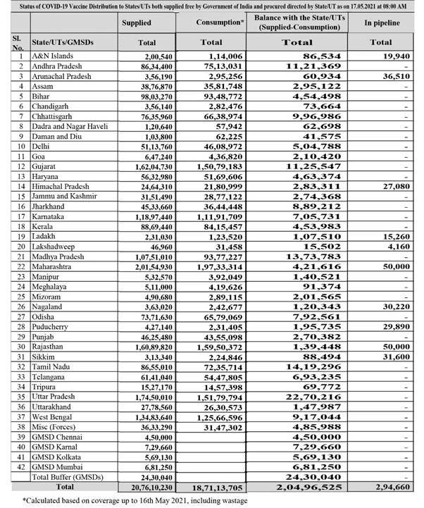 केंद्र सरकार ने राज्यों और केंद्रशासित प्रदेशों को अब तक 20 करोड़ से ज़्यादा वैक्सीन (20,76,10,230) प्रदान की हैं। इनमें से बरबाद हो जाने वाली वैक्सीनों को मिलाकर 16 मई, 2021 तक औसतन कुल 18,71,13,705 खुराकों की खपत हुई है। राज्यों और केंद्र शासित प्रदेशों के पास अब भी दो करोड़ से अधिक (2,04,96,525) कोविड वैक्सीन की खुराक मौजूद हैं, जिन्हें अभी लगाया जाना है। इसके अतिरिक्त लगभग तीन लाख (2,94,660) खुराक आपूर्ति प्रक्रिया में हैं और अगले तीन दिनों के भीतर राज्यों और केंद्र शासित प्रदेशों को भेज दी जायेंगी।
