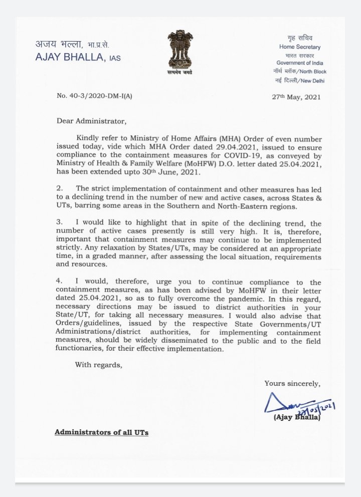 सभी राज्यों और संघ शासित प्रदेशों के मुख्य सचिवों को लिखे पत्र में केन्द्रीय गृह सचिव अजय भल्ला ने कहा कि स्वास्थ्य मंत्रालय द्वारा सुझाए गए रोकथाम के उपाय 30 जून तक बढा दिए गए हैं। भल्ला ने कहा कि लॉकडाउन और अन्य उपायों पर कडाई से अमल करने की बदौलत दक्षिणी और पूर्वोत्तर के कुछ क्षेत्रों को छोडकर सभी राज्यों और संघ शासित प्रदेशों में कोविड के नए रोगियों और उपचाराधीन रोगियों की संख्या में कमी आई है। उन्होंने कहा कि संक्रमण की दर में कमी की प्रवृति के बावजूद अभी उपचाराधीन रोगियों की संख्या बहुत अधिक है। इसलिए लॉकडाउन के उपाय महत्वपूर्ण हैं और राज्यों को शक्ति से उनका पालन करना चाहिए।