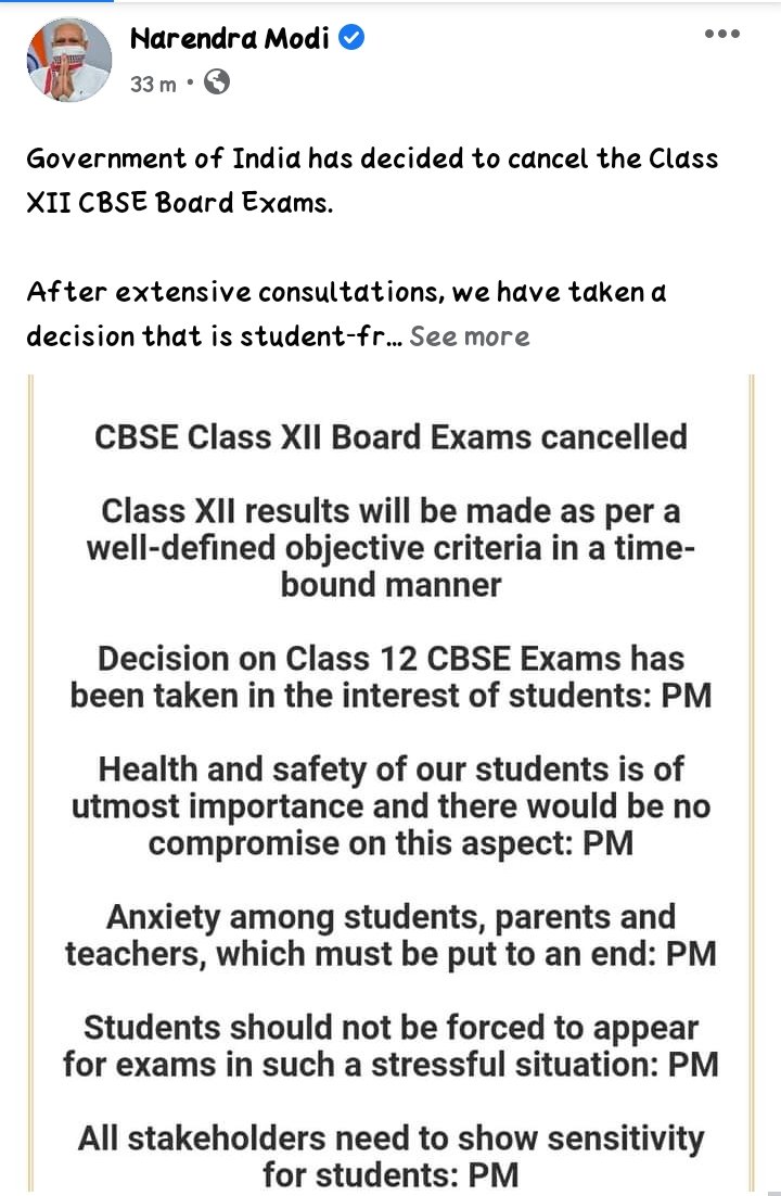 प्रधानमंत्री ने कहा कि सीबीएसई की 12वीं की परीक्षा पर फैसला छात्रों के हित में लिया गया है. उन्होंने कहा कि कोविड-19 ने अकादमिक कैलेंडर को प्रभावित किया है और बोर्ड परीक्षाओं का मुद्दा छात्रों, अभिभावकों और शिक्षकों में अत्यधिक चिंता पैदा कर रहा है, जिसे समाप्त किया जाना चाहिए.