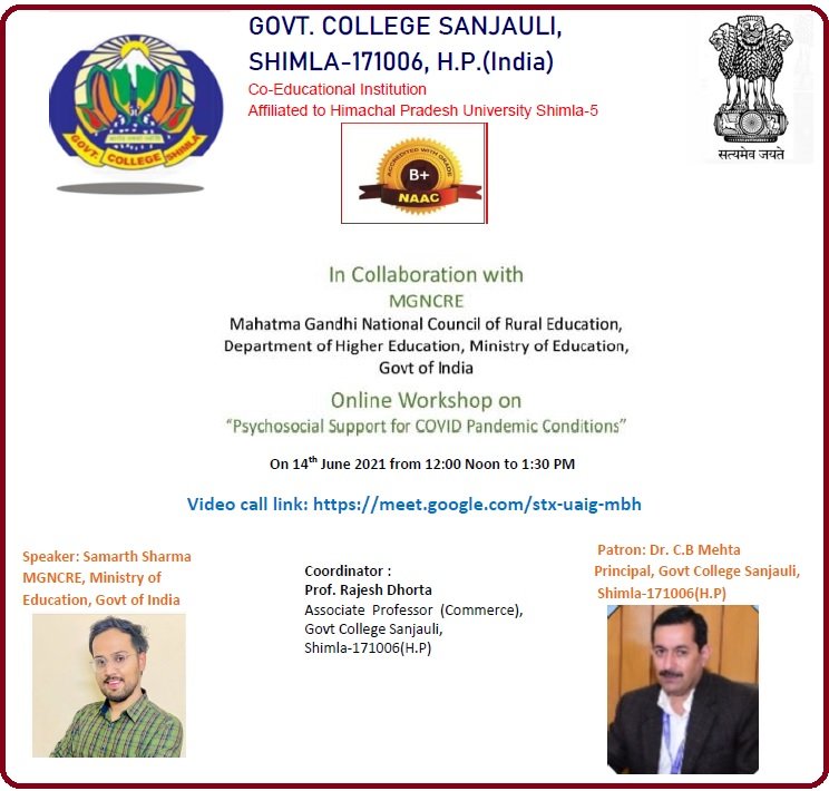 शिमला। कोरोना महमारी के कारण हर क्षेत्र प्रभावित है। शिक्षा, पेशों, व्यवसायों आदि से जुड़े लोगों को भारी नुकसान का सामना करना पड़ा है। ऐसे में इस महामारी ने जितना नुकसान आर्थिकी और जनमानस का किया है। उससे कहीं अधिक निराशा और मानसिक तनाव भी इस महामारी के कारण समाज में फैला है। ऐसे समय में छात्र कैसे ख़ुद को मानसिक रूप से हर परेशानी या विपदा के लिए तैयार रख सकें, इसी कड़ी में सोमवार को उत्कृष्ट शिक्षा केंद्र राजकीय महाविद्यालय संजौली में, ‘कोविड महामारी में मनोवैज्ञानिक संबल का महत्व’ विषय पर एक ऑनलाइन कार्यशाला का आयोजन किया गया।
