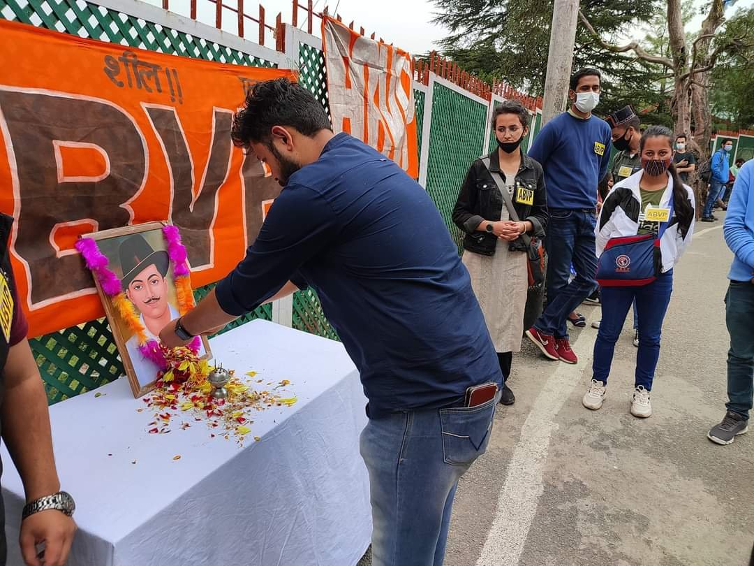 उन्होंने किस प्रकार से अंग्रेजी हुकूमत के खिलाफ प्रखर रूप से आवाज उठाई और किस प्रकार का उनका संघर्ष रहा है वर्तमान समय में युवा पीढ़ी को अध्ययन करने की आवश्यकता है। आकाश नेगी ने कहा कि अखिल भारतीय विद्यार्थी परिषद सदैव शहीद भगत सिंह जी की जन्म जयंती और उनकी पुण्यतिथि पर कोई न कोई आयोजन कर उनके आदर्शो और उनके विचारों को युवाओं तक पहुंचाने का कार्य करती रहती है, आज के दिन भी विद्यार्थी परिषद ने पुष्पांजलि अर्पित कर महामारी से बचाव के सभी मापदंडों को अपनाते हुए परिसर में गीत गाते हुए शहीद भगत सिंह जी की जन्म जयंती के रूप में आयोजन कर युवाओं के देश के प्रति कुछ करने का भाव जागृत किया।