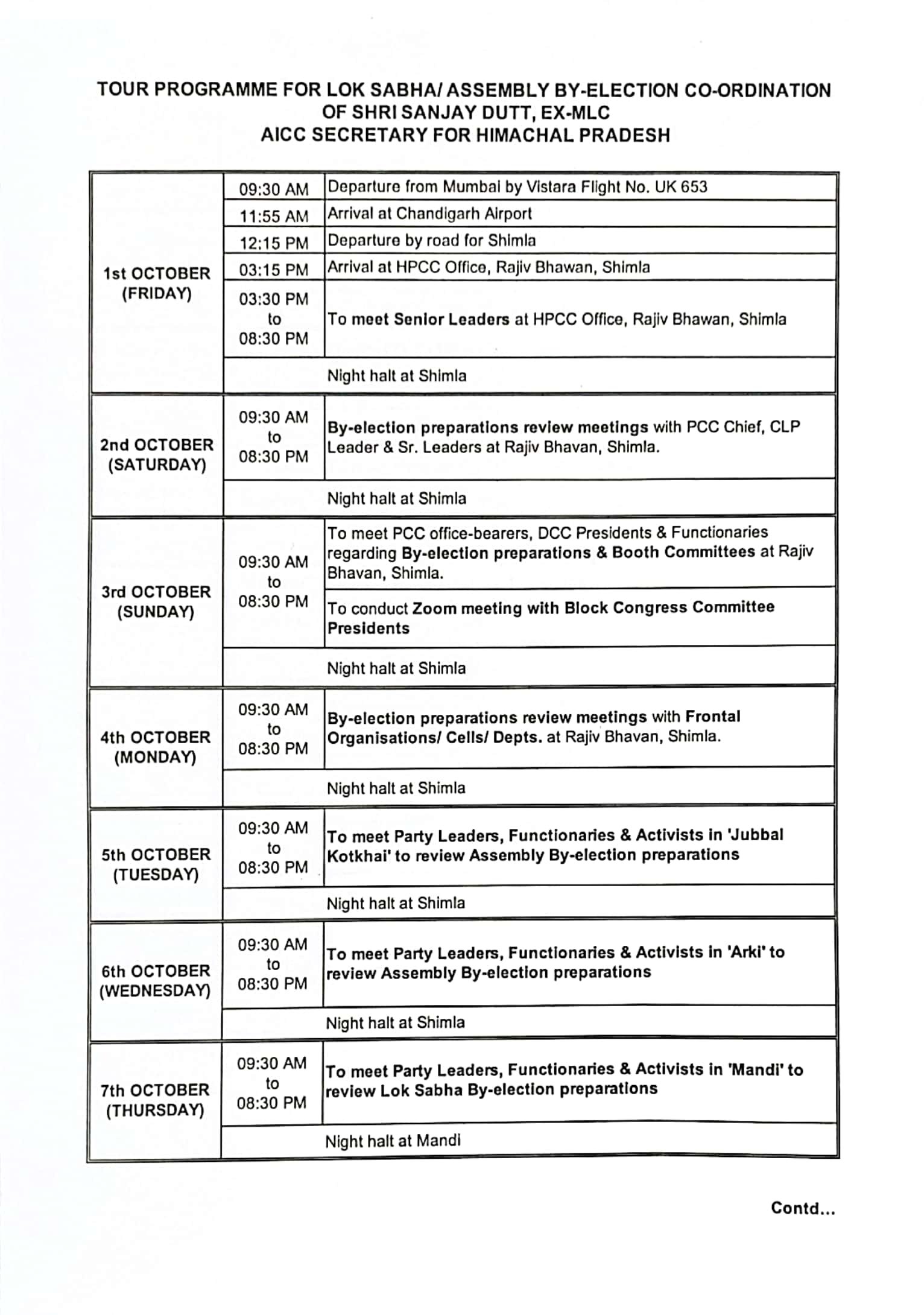 तय कार्यक्रम के अनुसार संजय दत्त 1 अक्टूबर को हिमाचल प्रदेश की राजधानी शिमला पहुंचेंगे। जिसके बाद तय कार्यक्रम के अनुसार अलग-अलग दिनों में हिमाचल प्रदेश कांग्रेस के नेताओं और पदाधिकारियों से मुलाकातों का सिलसिला शुरू होगा। जानकारी के अनुसार संजय दत्त का के द्वारा लगभग 15 दिनों का है जहां वह 1 तारीख को हिमाचल आएंगे तो 16 अक्टूबर को हिमाचल से प्रस्थान करेंगे।
