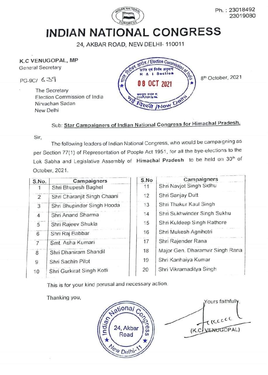 कांग्रेस की स्टार प्रचारकों की इस सूची में भूपेश बघेल राजीव शुक्ला चरणजीत सिंह चन्नी सचिन पायलट संजय दत्त भूपेंद्र सिंह हुड्डा और पंजाब कांग्रेस में खलबली मचाने वाले नवजोत सिंह सिद्धू का नाम शामिल है। इन नेताओं के अलावा इस सूची में आनंद शर्मा, सुखविंदर सिंह सुक्खू, कौल सिंह ठाकुर, आशा कुमारी समेत प्रदेश के सभी नेताओं के नाम शामिल हैं जो पहली सूची से गायब थे। अब किन आधारों पर और क्या सोचते हुए कांग्रेस ने यह सूचियां तैयार की , और क्या कारण रहे कि जिस सूची में प्रदेश के सभी बड़े नेताओं के नाम शामिल थे, उस सूची में प्रदेश के इन नेताओं के नाम मौजूद नहीं थे जिन्हें दूसरी सूची में जगह दी गई है।