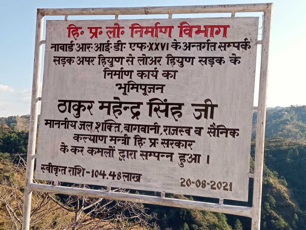 फिर इस सड़क पर कंक्रीट डालने का मंत्री ने भूमि पूजन किया। उसके बाद इस सड़क को नाबार्ड के तहत बनाने का शिलान्यास किया गया। जिसके बाद 29 नवंबर को मुख्यमंत्री ने धर्मपुर से इसका शिलान्यास किया और आज पांचवी बार मंत्री ने हियुन जाकर उसका शिलान्यास किया।