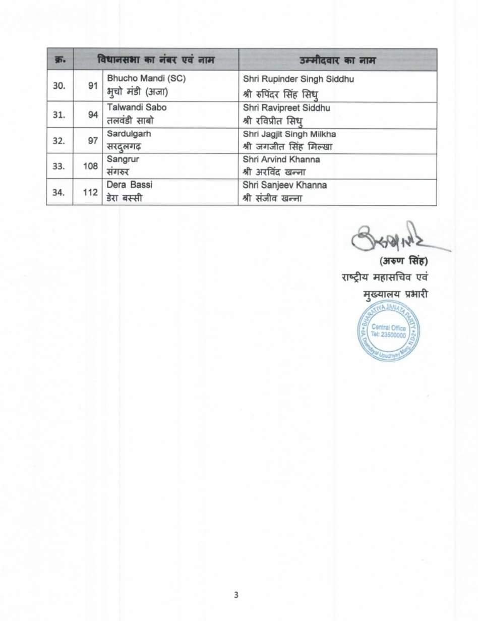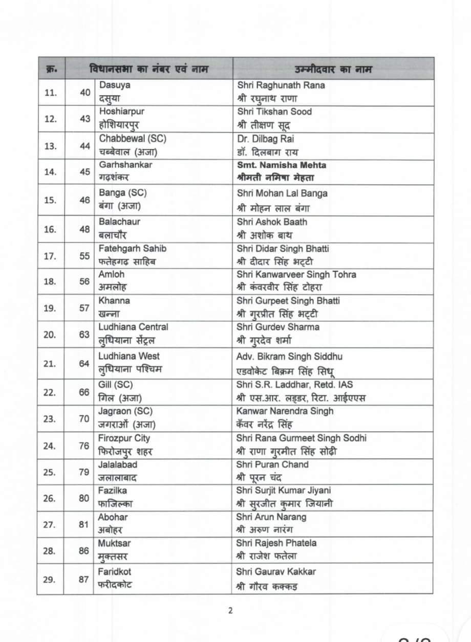 सीटों की बात करें तो जालंधर सेंट्रल से मनोरंजन कालिया, दसूहा से रघुनाथ राणा, गढ़शंकर से नामिशा मेहता, तरनतारन से नवरीत सिंह लवली, मुकेरिया से जंगिलाल महाजन, लुधियाना सेंट्रल से गुरुदेव शर्मा, फतेहगढ़ साहिब से दीदार सिंह भटी को टिकट मिला है।