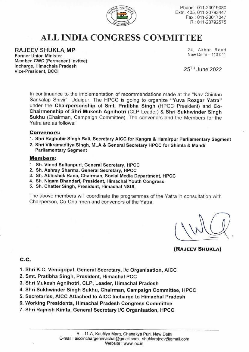 कांग्रेस के हिमाचल प्रभारी राजीव शुक्ला की तरफ से इस यात्रा के लिए जिम्मेदार पदाधिकारियों की घोषणा कर दी गई है। कांग्रेस के राष्ट्रीय सचिव आरएस बाली को कांगड़ा और हमीरपुर का प्रभारी बनाया गया है। जबकि कांग्रेस विधायक विक्रमादित्य सिंह को शिमला और मंडी की जिम्मेदारी सौंप कर प्रभारी बनाया गया है। उधर, इस यात्रा की टीम के 5 सदस्य भी बनाए गए हैं, जिनमें विनोद सुल्तानपुरी, आश्रय शर्मा, अभिषेक राणा, निगम भंडारी और छत्तर सिंह शामिल हैं।